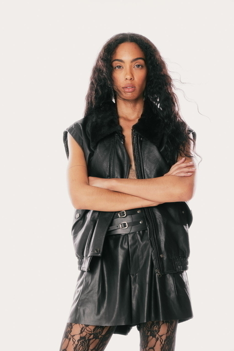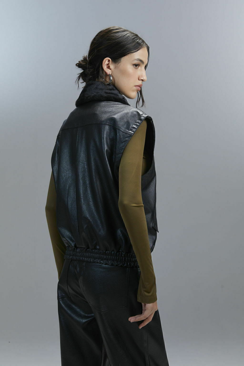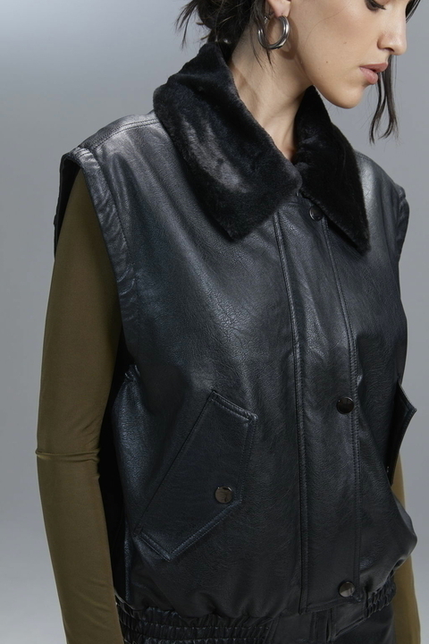acceso a la prenda es mediante un cierre metálico desmontable y una solapa abrochable que cubre del mismo. Su cintura es elástica. Lleva como complemento un sobrecuello extraíble de piel sintetica