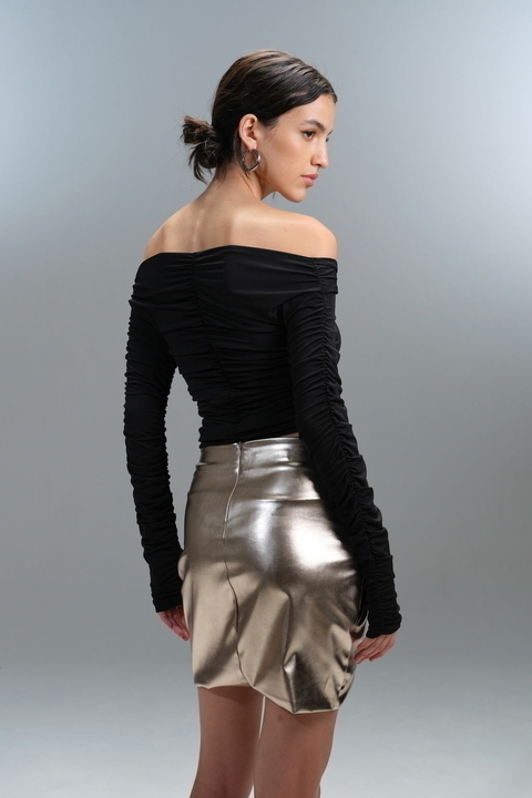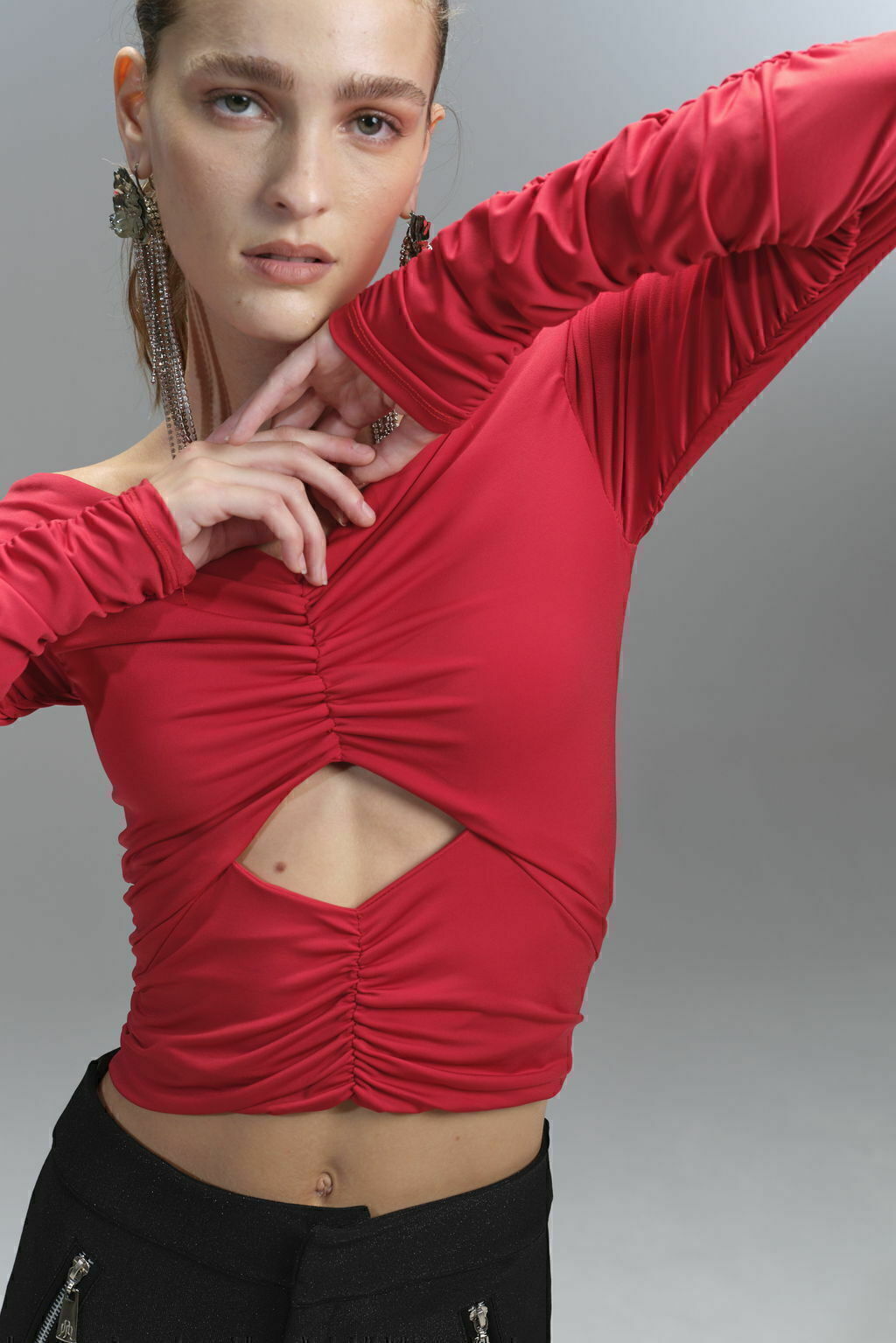 Top off shoulders, manga larga con un cut-out en el centro delantero. Lleva elásticos en todas sus uniones los cuales generan frunces a través de todo el top. Su largo es hasta la cintura.
